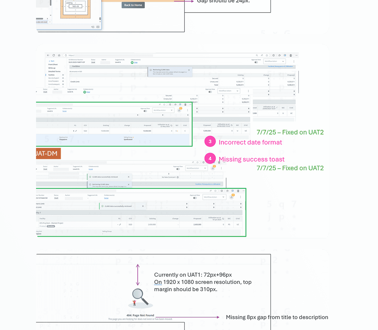 Conducted multi-environment consistency checks across UAT1, UAT2, and Production to ensure platform-wide UI and copy alignment. Drove internal QA documentation and supported developers on identifying and resolving design deviations.